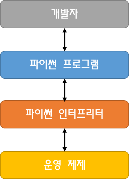 그럼 왜 언어가 필요한 것인가? 라는 의문이 들 수 있다. 기본적으로 컴퓨터는 기계어(0과 1로 이루어진)로 소통하기 때문에 사람이 기계어를 직접 작성하기 어려울 것이다. 숫자조차도 표현하기 어려웠는데 이 많은 데이터들을 어떻게 직접 바꾸겠는가? 언어가 불일치하는 컴퓨터와 소통하는 프로그램이 있는 것이다. 쉽게 말하면 아랍인과 대화하기 위한 번역기라고 보면 편할 것 같다. 이를 '파이썬 인터프리터' 라고 한다.