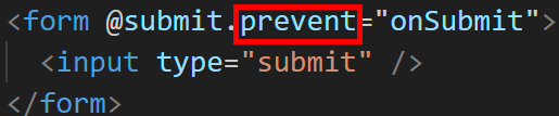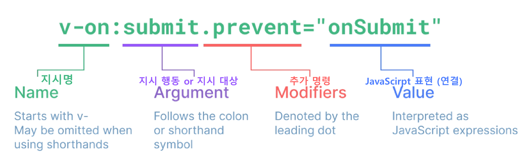: 예를들어 JavaScript에서 form의 submit event에 사용하던 event.preventDefault()를 호출하던 것을 v-on에 지시하는 modifier로 지정해줄 수 있다.
