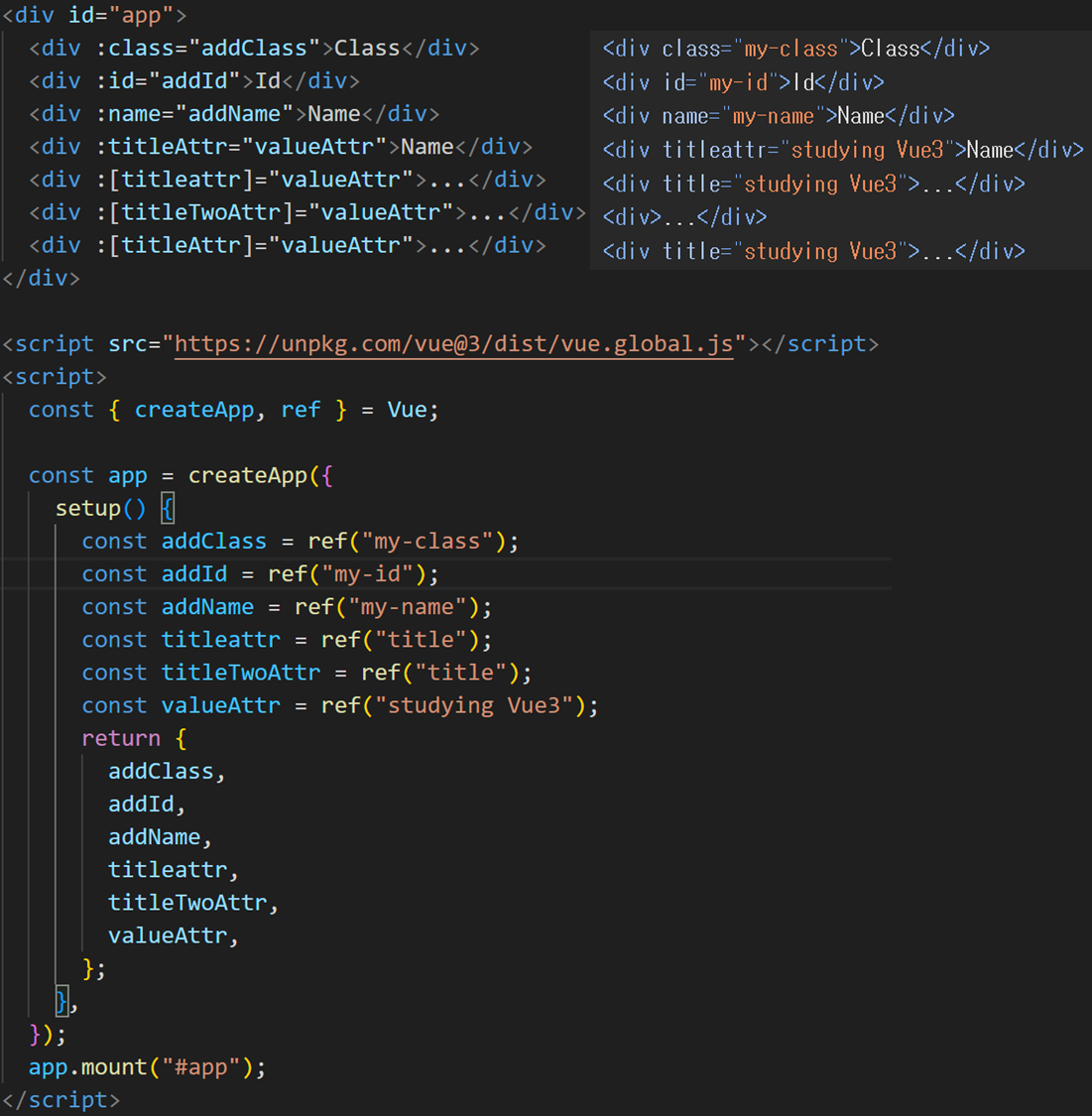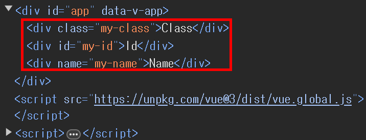 | v-bind = "속성" | HTML 요소를 동적으로 바인딩 (축약표현 :="속성" ) |