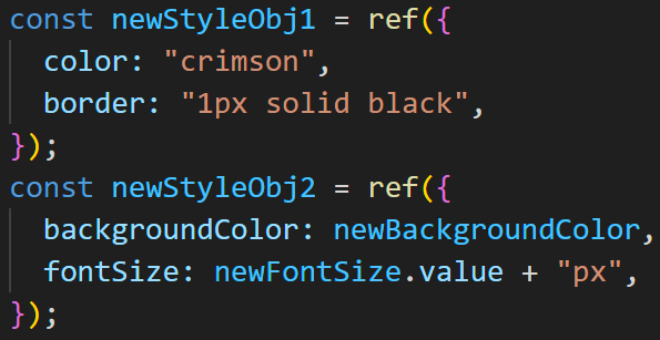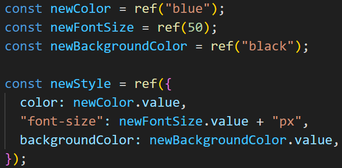 객체 내부에 데이터가 있으며 font-size의 경우 평가되기 전 데이터에 문자열과 합쳐지는 과정이 있어서 unwrapping이 진행되지 않는다. 따라서 .value를 써야만 한다. (이외 newColor와 newBackgroundColor는 ref()로 감쌀경우 value를 생략할 순 있다)
