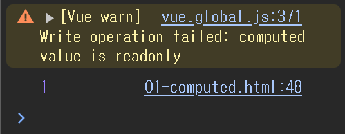 또한 computed로 생성된 데이터는 읽기 전용 속성을 띄기 때문에 치명적인 오류는 아니지만 오류 알람이 오게된다. 따라서 computed로 만들어진 데이터에는 접근하지 않는 것이 Syntax적으로 맞는 방향이다.