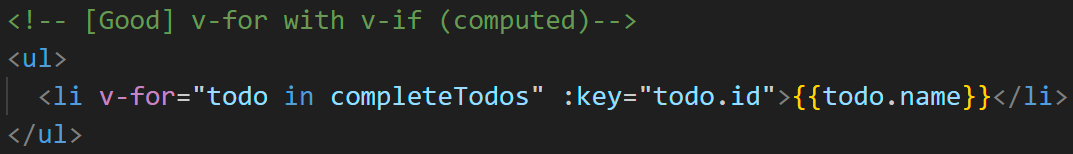 이전 시간에 배웠던 v-for에서 반복문과 조건문이 중복되었을 때, 해결법으로 computed를 활용해서 필터링 된 목록을 반환하여 반복을 할 수 있다. computed + filter는 자주 쓰이는 조합이다.