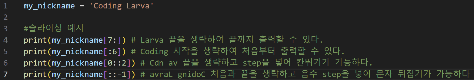 - 슬라이싱(Slicing) : 인덱스 범위를 조절하여 부분적인 값을 추출하는 방식