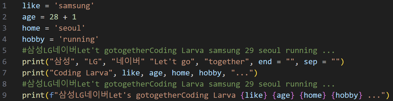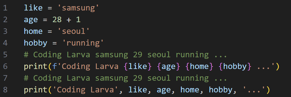 프린트하는 내용을 직관적으로 볼 수 있고, 코드를 줄일 수 있기 때문에 나중엔 필수가 되었다. 또한 별 생각 없이 문자열과 변수를 난무할 때 구분만으로 바로 원하는 출력을 할 수 있다는 장점이 있다.