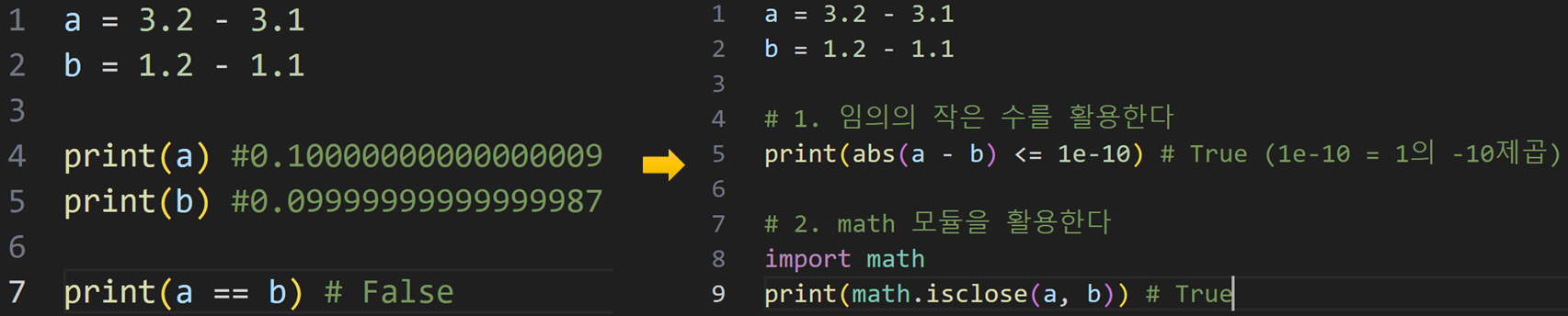 # 1 을 보면 'a - b 에 절댓값이 1의 -10제곱보다 작다.' 즉 오차가 0.0000000001보다 작다면 True를 출력해 두수의 차이가 그만큼 작다는 것을 보여준다. (참고로 e의 지수표현은 소수점을 나타낼때 유용하니 꼭 알아두도록 하자)