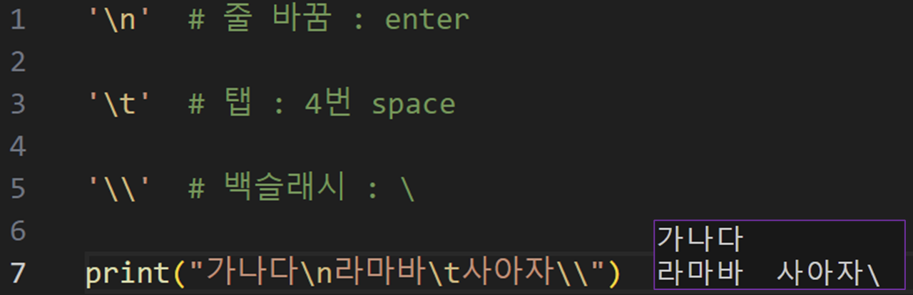 - 아래 말고도 \r (캐리지 리턴 : 처음으로 이동), \o (널 : Null) 도 있긴하나 아직은 본적 없다.