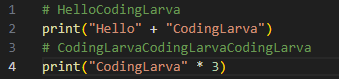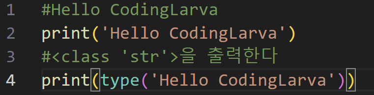 앞서 계속 다뤄왔던 문자열은 단일 문자나 여러 문자의 조합으로 이루어진 것이다. 정의가 참 어렵다. 내 뇌속엔 ' ' 혹은 " " 으로 감싸져 있는 글자들을 문자열이라고 생각한다. 코딩을 가장 먼저 시작하면서 찍어 보았던 print('Hello CodingLarva')와 같다. 또한 타입을 출력해보면 다음과 같다.