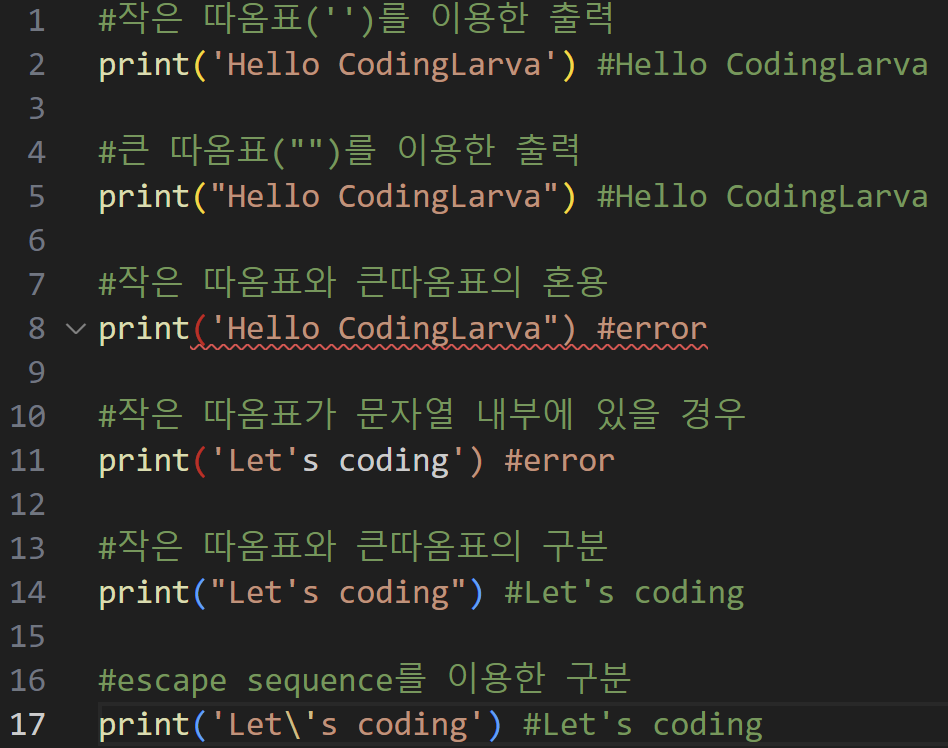 문자열을 출력할 때 주의할 점이 있다. 이는 ' ' 와 " " 의 혼용이다.