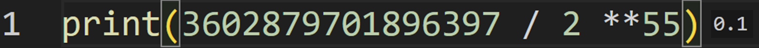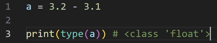 실수를 표현하는 자료형. 실제로는 실수에 대한 근삿값 이다. 소수점을 표현할 때 사용하는데, 연산 시 주의할 점이 있다. 이전에 인터프리터(번역기)에 대해 설명하면서 컴퓨터는 0과 1을 사용하는 2진수에 대해서만 입출력 한다고 언급한 적이있다. 하지만 사람은 10진법을 사용하고 이때 10진수 0.1을 2진수로 표현하면 무한대로 반복되는 이진법을 만들어 버린다. 그렇다면 컴퓨터는 고작 0.1을 표현하기 위해 무한대로 저장하면 과연 효율적일까??? 이를 막기위해 근삿값만 표시하게 된다. 앞서 얘기한 0.1은 (3602879701896397 / 2 **55) 으로 저장된다. 실제로 VSCode에서 돌려보면 0.1을 출력한다.