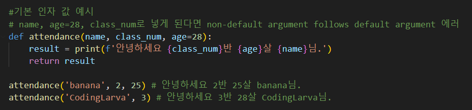 매개변수 위치에 '매개변수 = 값' : 함수의 기본값을 설정. 위치인자를 받을 것이 있다면 그 뒤로 위치시킨다.