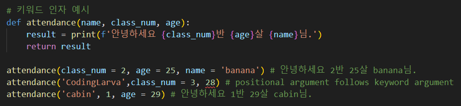 키워드 인자의 순서는 위치 인자 뒤에만 올 수 있다. 하지만 키워드 인자를 모두 할당한다면 섞여도 무관하다. 키워드 인자 이후 위치 인자는 실행조차 하지 않는다고 생각하면 편하다.