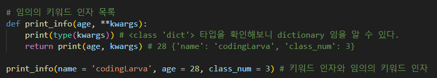 :정해지지 않은 개수의 키워드 인자를 처리하는 인자이며 키워드 인자가 몇개 들어갈 지 모르는 상태로 사용하는 방식이다. 사실 실적용을 해본적이 없어서 어떻게 쓰이는지 모르겠으나 이 방법도 다른방법과 같이 섞어서 사용이 가능하다