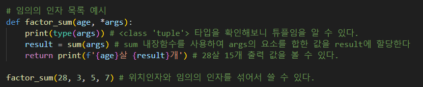 : 정해지지 않은 개수의 인자를 처리할 때 사용하는 인자이다. 우리가 가장 흔히 사용하는 내장 함수에서 print( )를 알 것인데, 사용해볼 때 print( A, B, C) 이나 print( 1, 23, 15, 4) 등을 해본적 있을 것인데, 이는 이미 괄호 안을 임의의 인자로 설계해놨기 때문이다. 이처럼 안에 몇개의 인자가 들어갈 지 모르는 함수를 정의할 때 사용한다.
