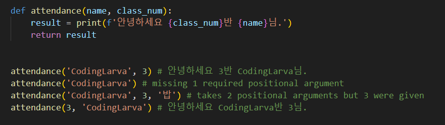 : 함수를 호출할 때 인자의 위치에 따라 전달되는 인자이다. 위치인자는 함수 호출 시 반드시 매개변수와 동일한 갯수의 인자 갯수를 전달해야 한다.