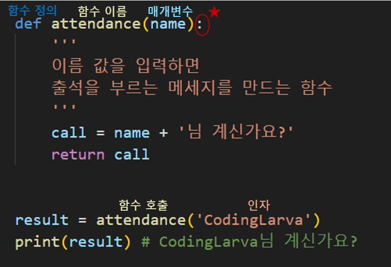 : 함수를 만드는 것이며 def 키워드로 시작, 매개변수 이후 : 을 꼭 붙여주어야 한다.