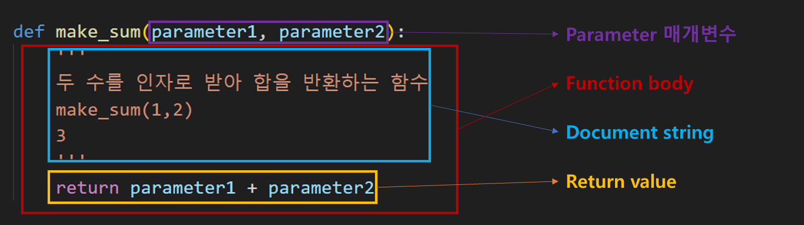 - Function body : 함수의 몸통 부분을 의미하며 함수에 대한 설명 + 함수 + return value를 통틀어서 function body라고 한다.