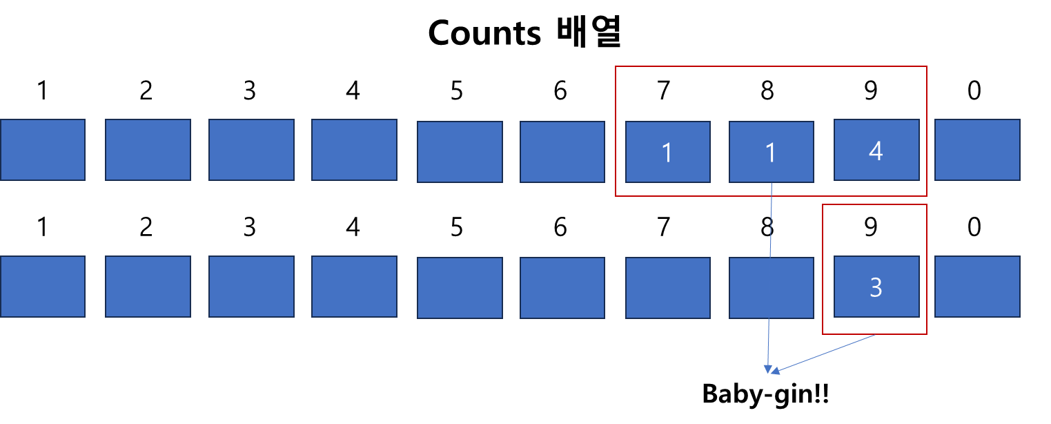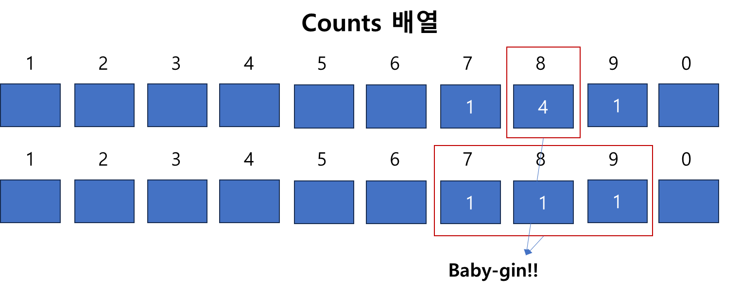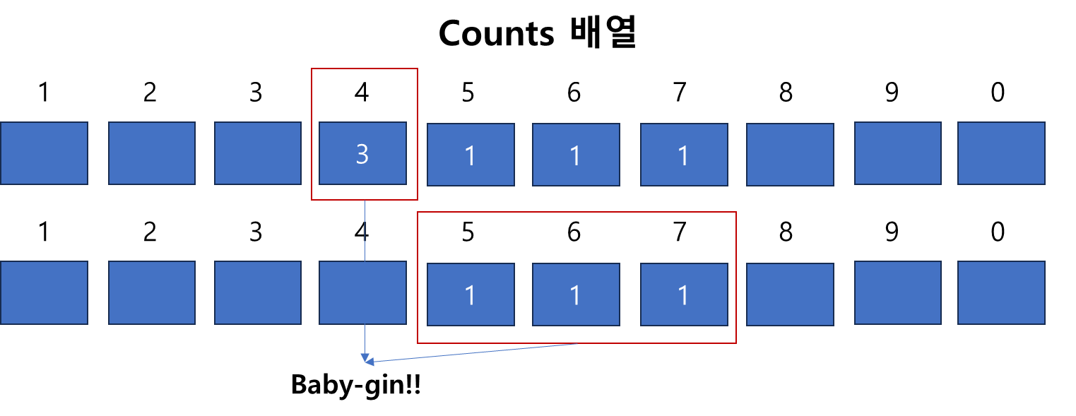 그렇다면 위의 방식으로 baby-gin 여부를 판단하는 알고리즘을 어떻게 만들면 될까?