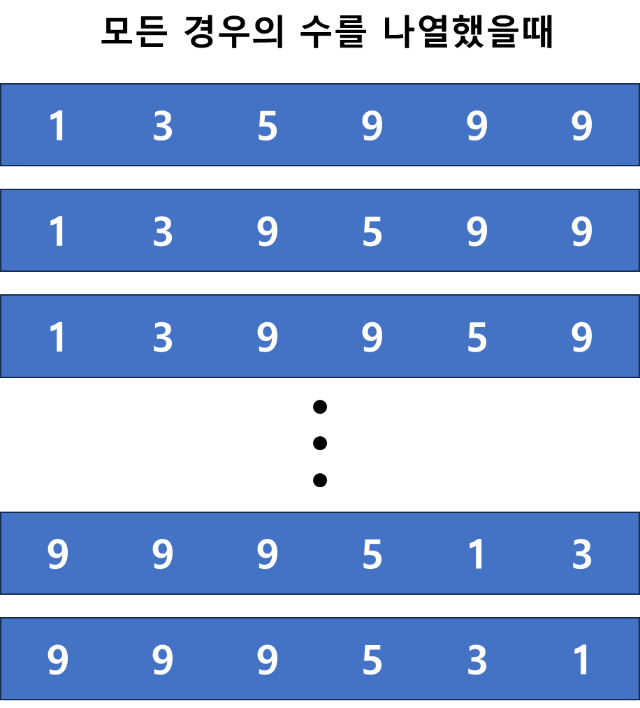 예를들어 [1, 3, 5, 9, 9, 9]를 받았다면 모든 경우를 나열해본다. (순열)