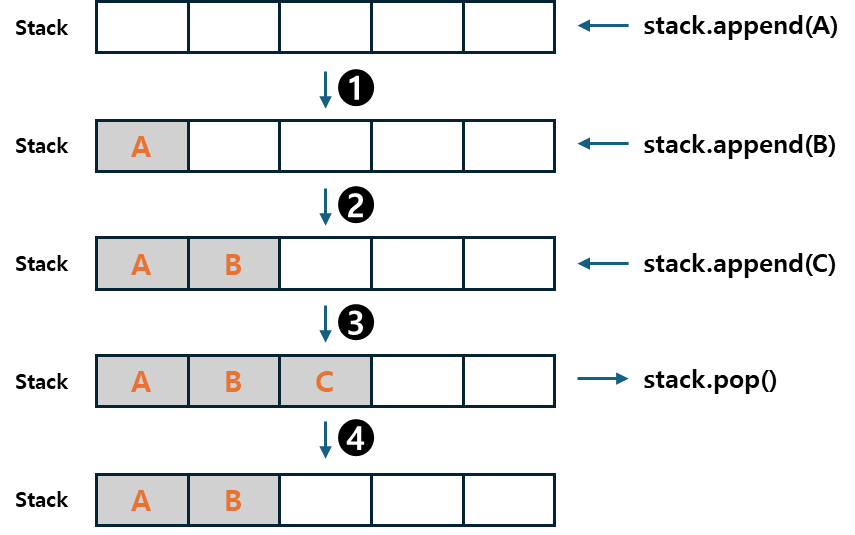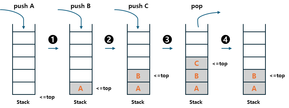 비어있는 스택에 데이터 A, B, C를 차례로 3번 삽입 후에 한번 삭제하는 과정을 그림으로 표현했다