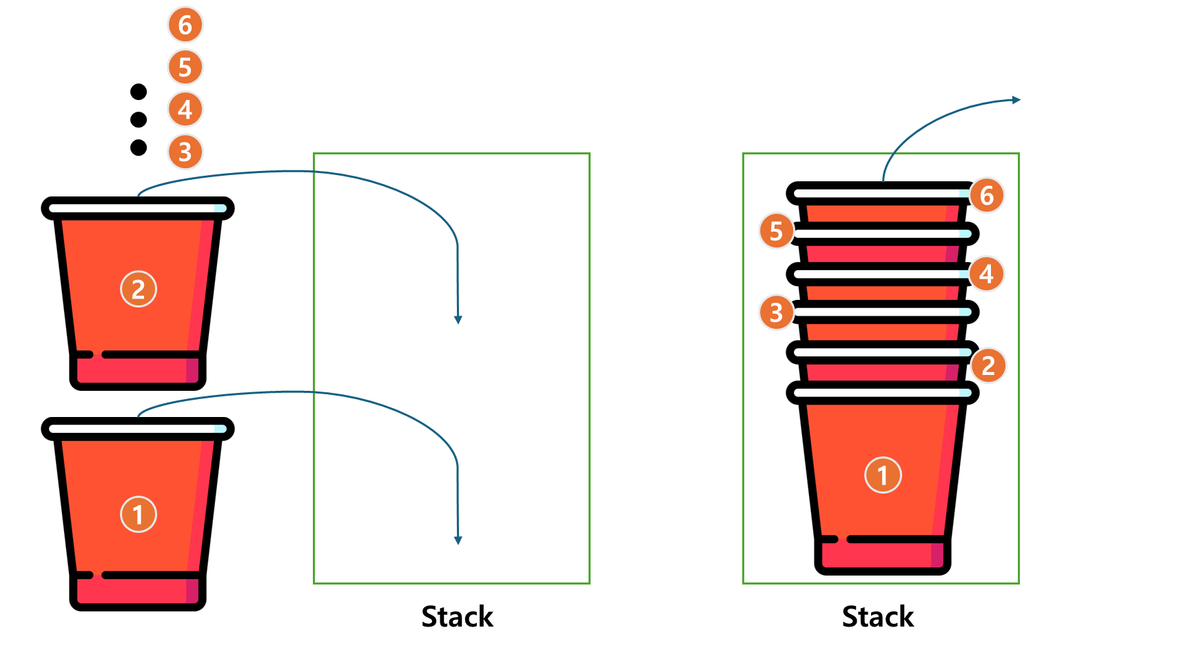 : 데이터를 후입 선출 구조 (LIFO : Last In, First Out 구조)이며 가장 최근에 들어온 데이터가 가장 먼저 빠진다는 개념이다. 실생활 예시로는 설거지한 컵들을 정리할 때, 가장 위에 있는 컵이 가장 먼저 사용될 것이고, 마지막 맨 아래의 컵은 마지막에 사용된다고 생각하면 좋을 것 같다.