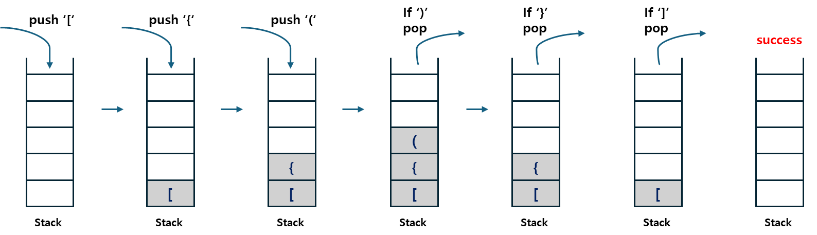 문자열에 있는 괄호를 차례대로 조사하면서 왼쪽 괄호를 만나면 Stack에 삽입하고, 오른쪽 괄호를 만나면 Stack에서 'top부분=stack[-1]' 을 삭제 및 꺼낸 후 오른쪽 괄호와 짝이 맞는지 검사한다.