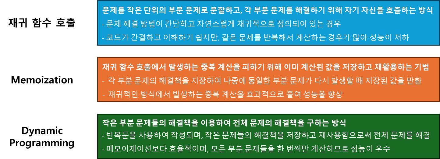 - memoization을 재귀적 구조에 사용하는 것보다 반복적 구조로 DP를 구현한 것이 성능면에서 효율적
