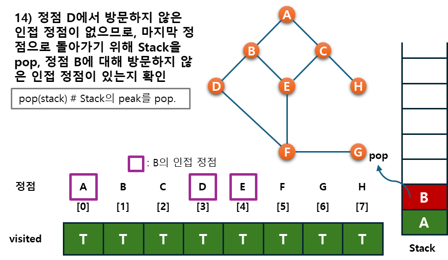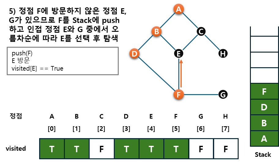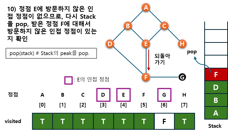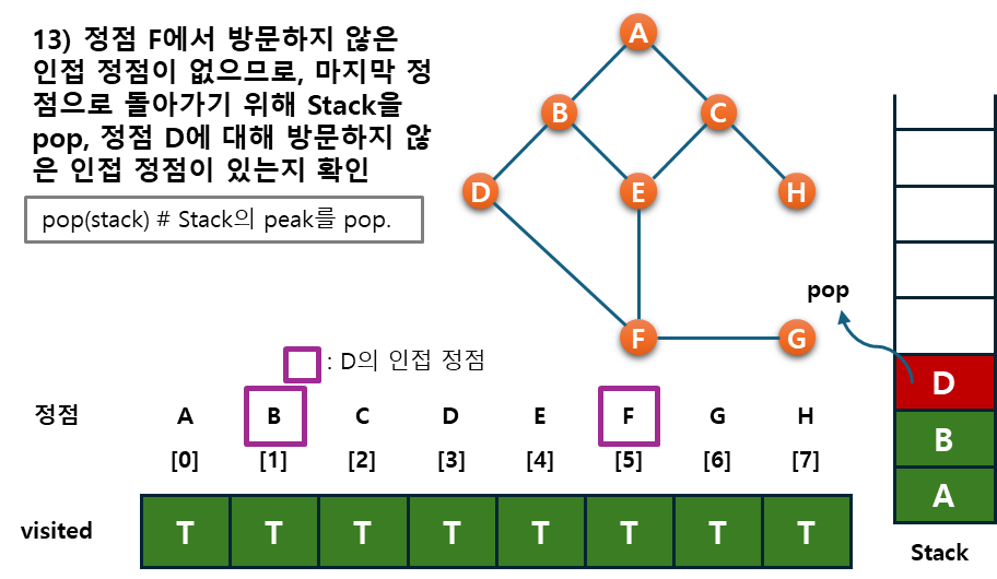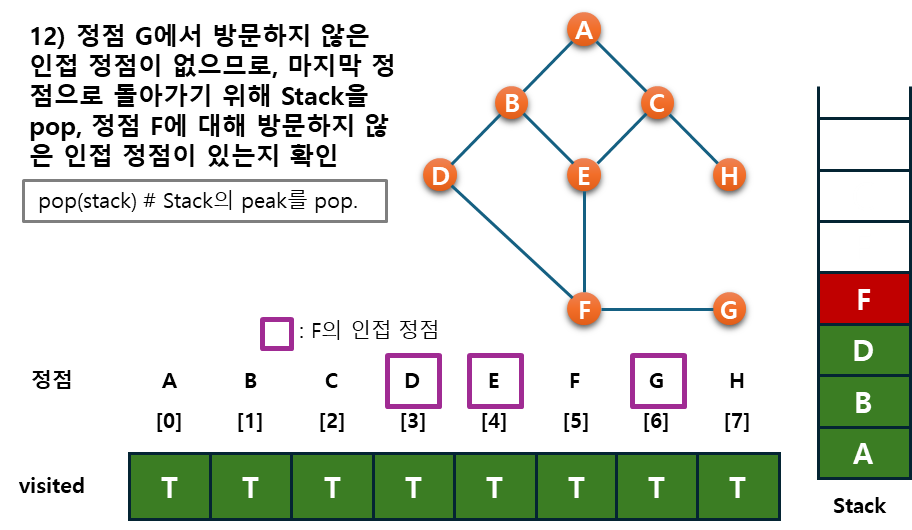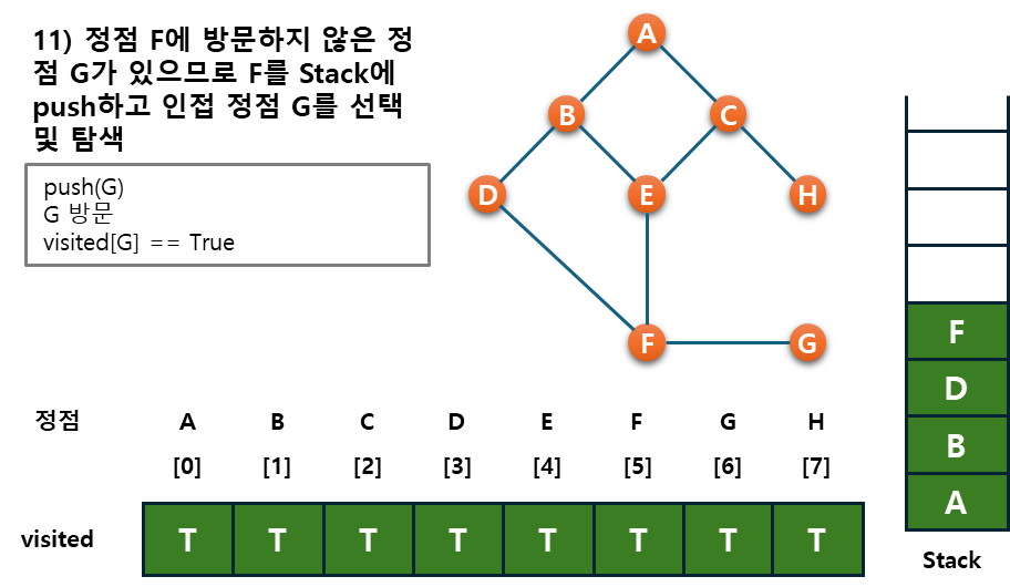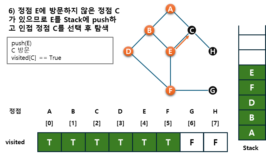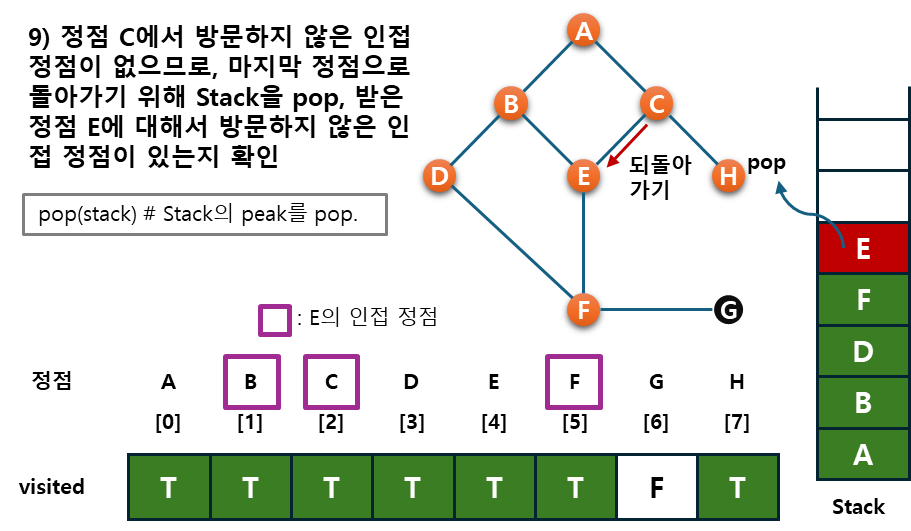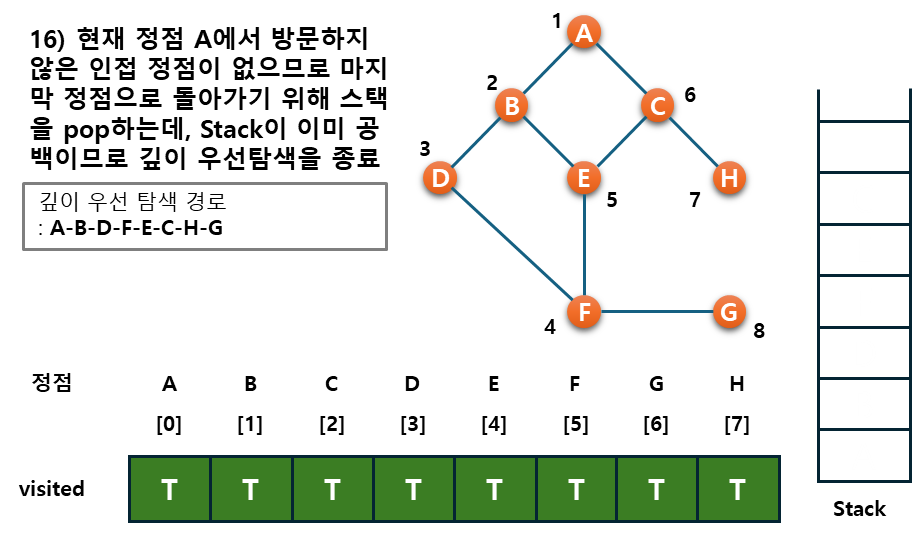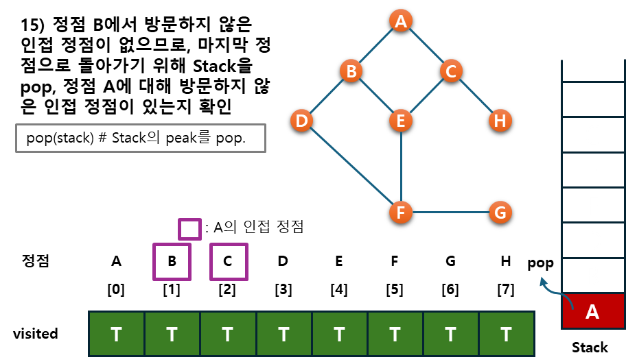- 후퇴단계 : 방문하지 않은 정점이 없으면, 탐색의 방향을 바꾸기 위해서 스택을 제거(pop)하여 받은 가장 마지막 방문 정점 v로 하여 다시 2)를 반복한다.