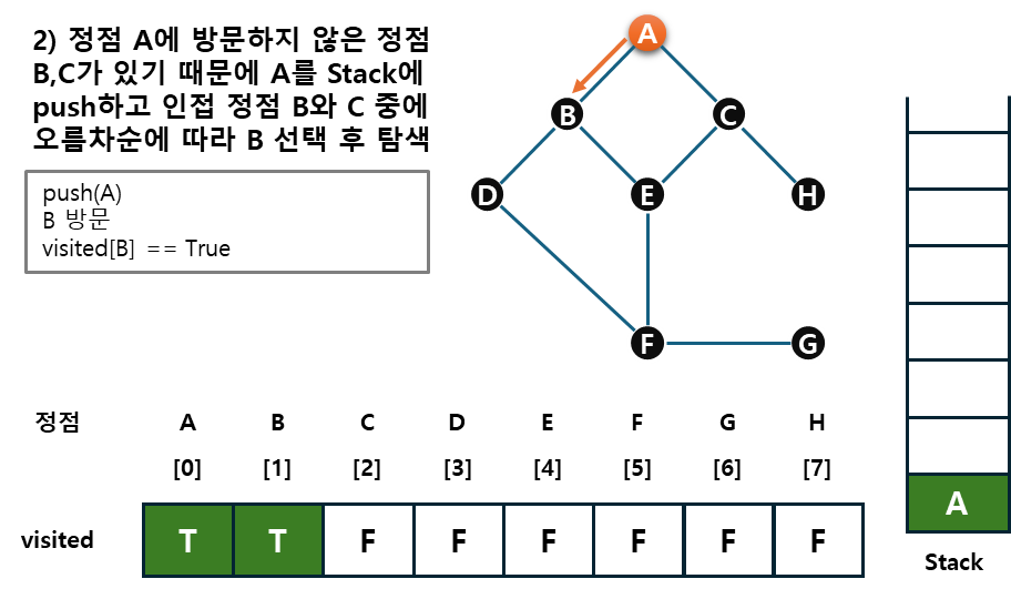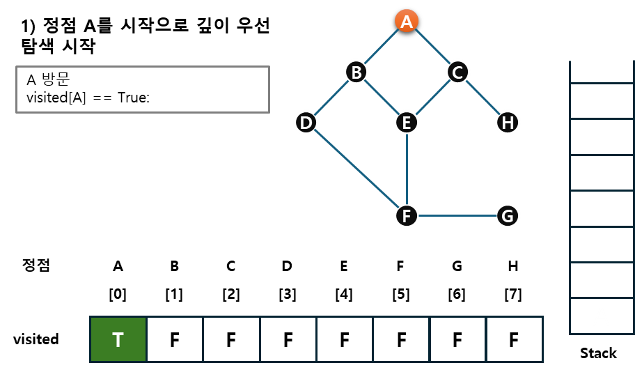 예시를 통해 그래프, stack, visited를 살펴보자.