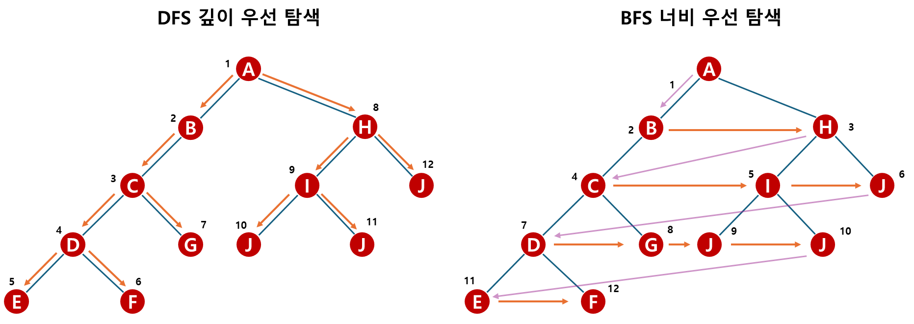 : 시작 정점의 한 방향으로 갈 수 있는 경로가 있는 곳(가장 깊은 곳)까지 깊이 탐색해 가다가 더이상 갈 곳이 없게 되면, 가장 마지막에 만났던 갈림길 간선이 있는 정점으로 되돌아와서 다른 방향의 정점으로 탐색을 계속 반복하여 결국 모든 정점을 방문하는 순회 방법
