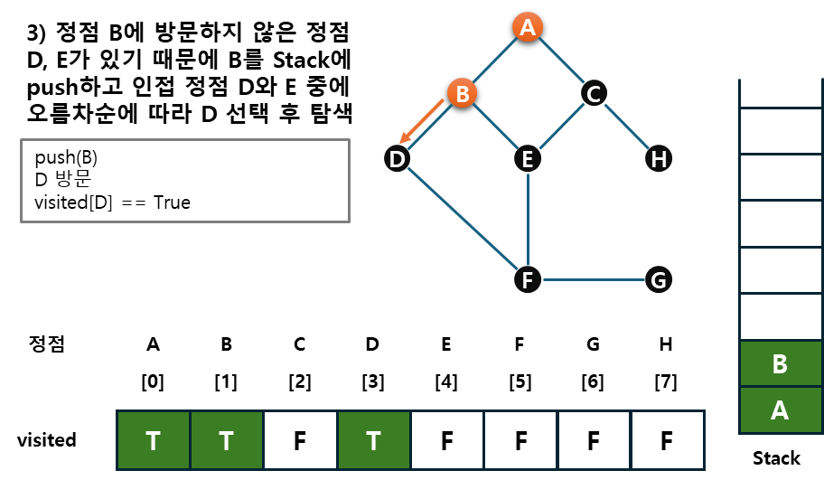 - 탐색단계 : 방문 하지 않은 정점 w가 있으면, 정점 v를 스택에 추가(push)하고 정점 w를 방문한다. 그리고 w를 v로 하여 다시 2)를 반복한다.