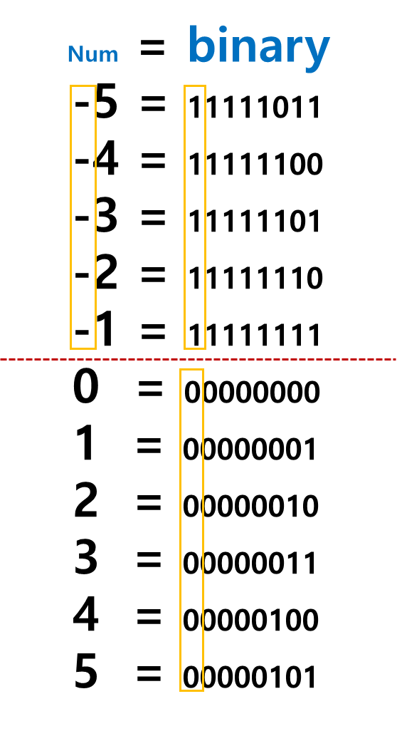 - 맨 앞자리(최상위) bit (MSB = Most Significant Bit)는 음수 or 양수를 구분하는 비트이다