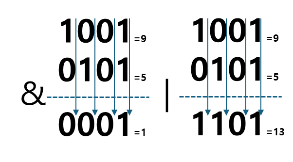 | & | 비트 단위로 AND 연산을 한다 두 개의 비트가 모두 1일 때 결과 비트가 1이 된다. 그 외에는 0이다. ex) num_a & num_b |