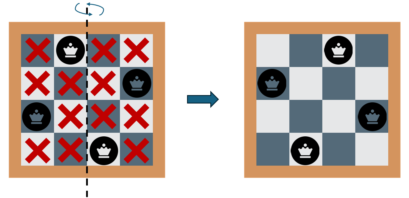 물론 전치는 틀렸다. 왜냐면 끝까지 배열을 해봐야 Queen이 지정되니까. 근데 내 잔머리는 한단계 진화했다. '근데 이거되는 경우들이 대칭인 것 같은데?'
