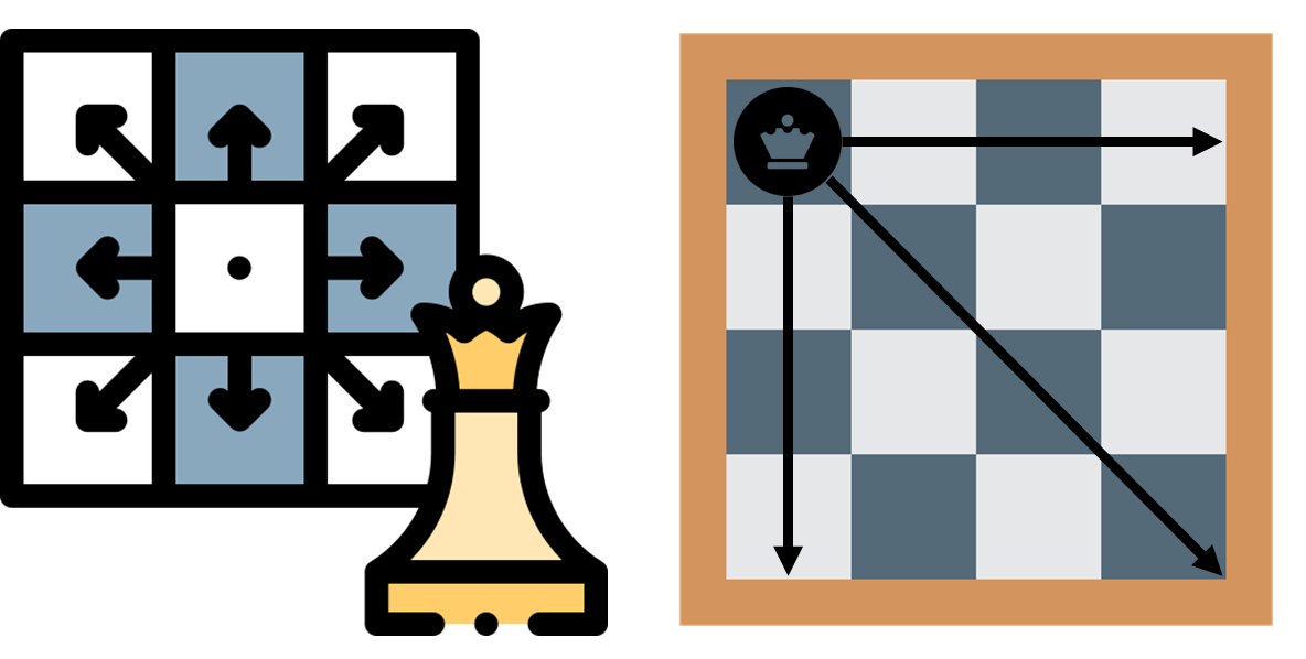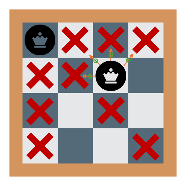 Queen의 경로가서로 겹치지 않게 채워나가면서 가능한 모든 곳에 queen을 놓았을 때, queen의 개수가 주어진 N과 같은지 확인하면 된다. 하나 Queen은 8방향 끝까지 표시된다.
