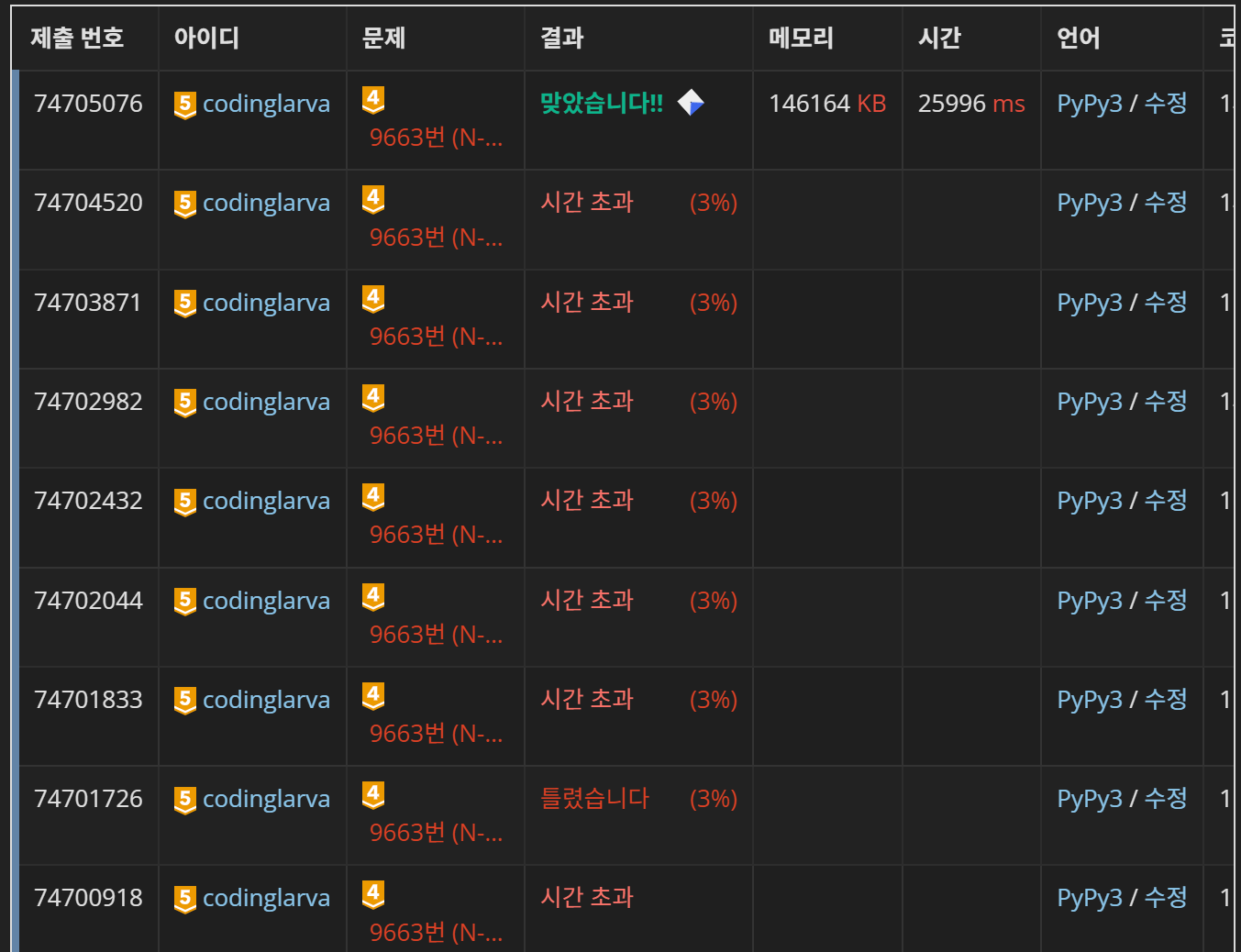 델타 탐색의 극한의 극한까지 가지치기해서 겨우겨우 통과한 케이스다. 시간이 오래걸렸는데 왜 게시하나 싶지만, 문제를 7-8시간 동안 잡고있으면서 누가 문제를 이렇게 길게 투자하느냐 하겠지만, 풀면서 이런 저런 시행착오를 통해 재귀와 함수를 정의해서 사용하는 연습을 한 것 같아서 의미가 있는 문제라고 였다. 또, 이런 방법으로 시간 자체를 줄일 수 있다는 경험 자체가 중요하다고 생각했기 때문이다. (사실 결과를 알고 줄이는 느낌이라 얘도 아이디어 싸움이긴 했다)