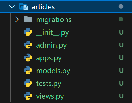 >> 새로운 앱의 구조를 정의하고 앱이 동작하는데필요한 코드와 설정을 포함 하는 'articles' 라는 이름을가진 새로운 디렉토리가 프로젝트 디렉토리 내에 생성