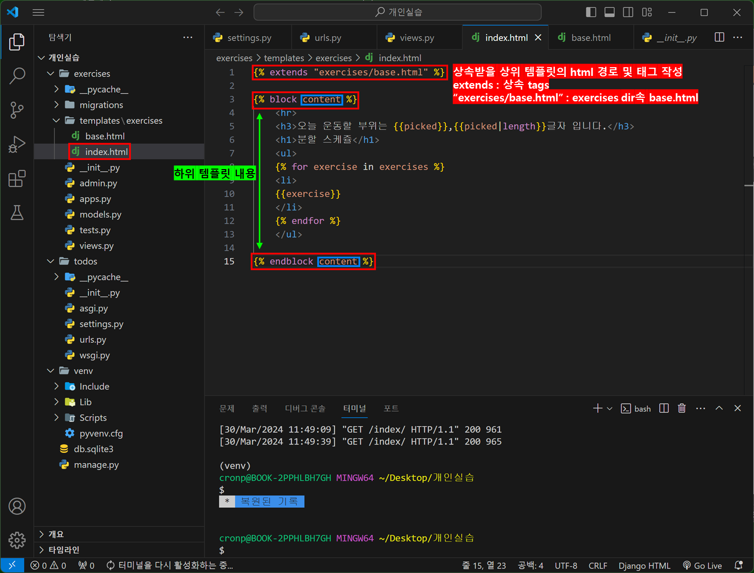 (혹시 자동완성이 안된다면 언어모드를 HTML이 아닌 Django HTML로 변경하면 된다)