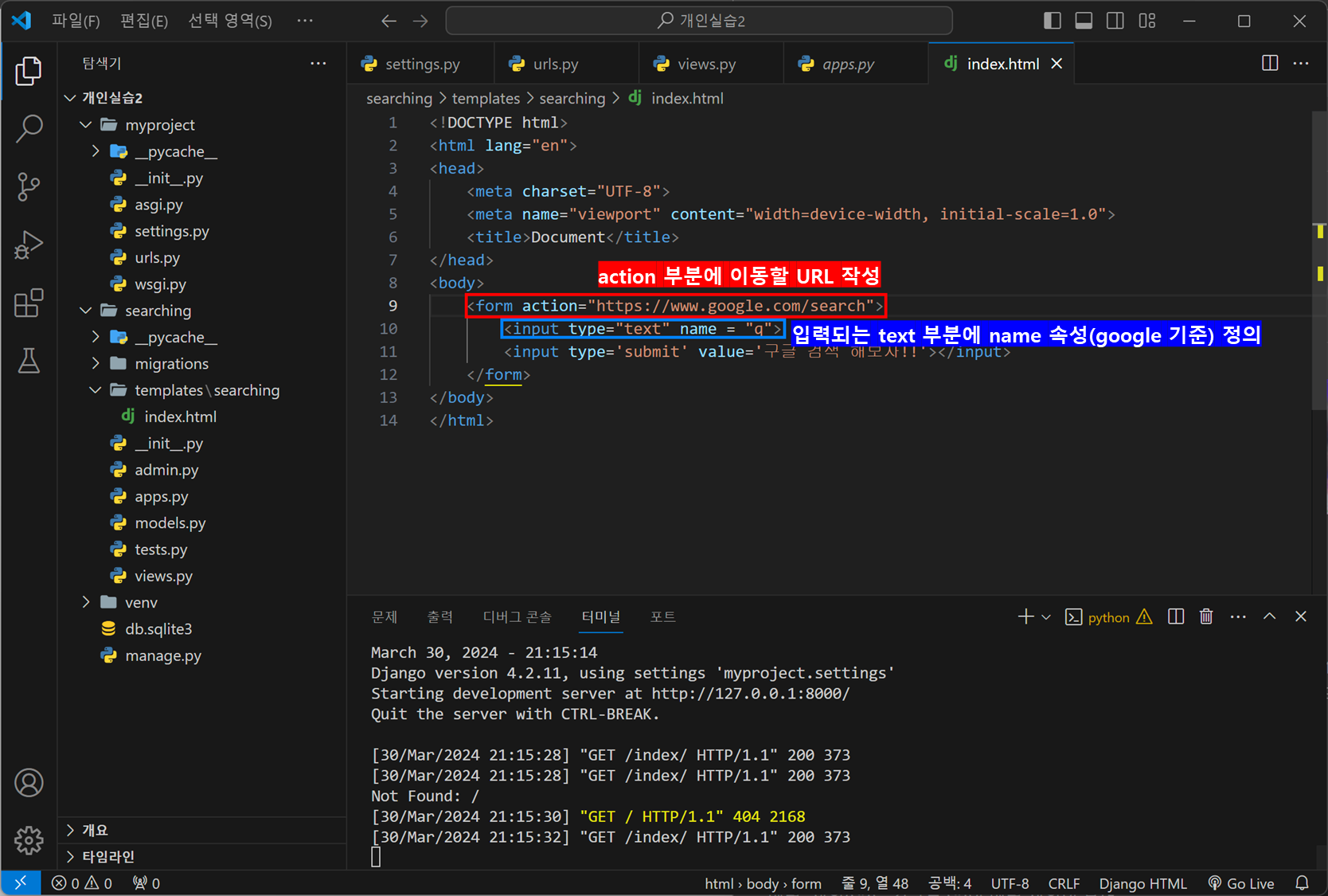 : 데이터를 어디(action)로 어떤 방식(method)으로 요청한다.
