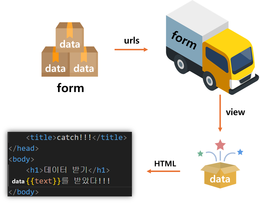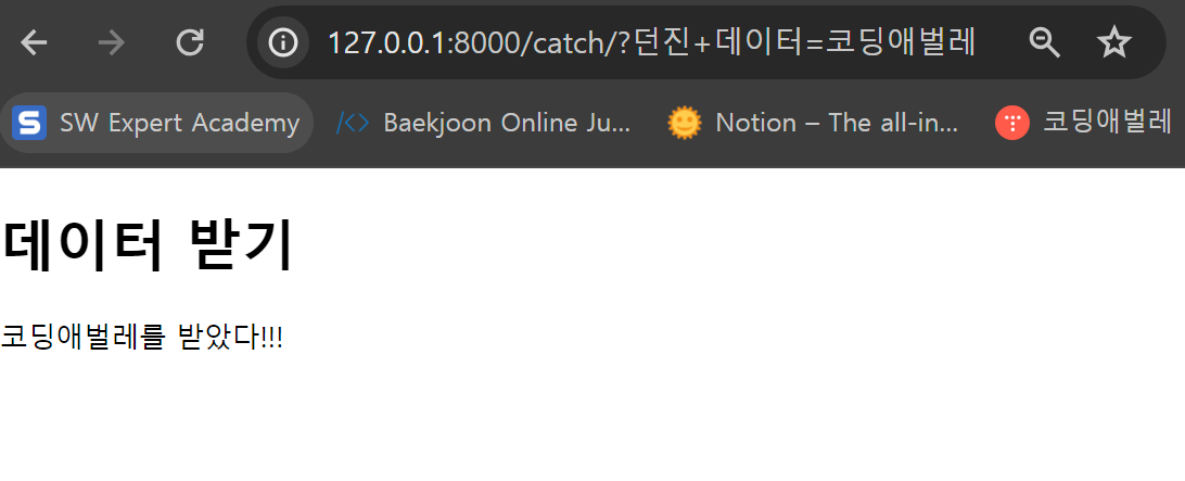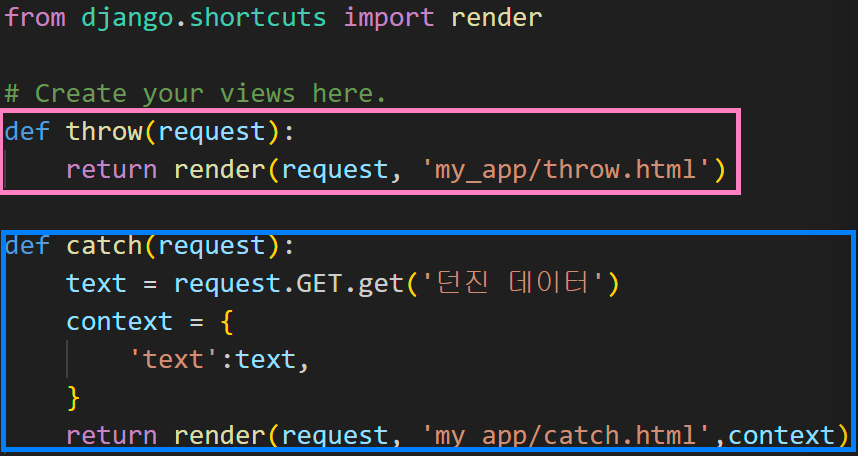 데이터를 던져주는 Throw, 데이터를 받아 출력하는 Catch가 필요하다. 캐치볼 게임을 한다고 생각하면 편할 것 같다. 그렇다면 필요한 요소는 뭘까? View 함수에 필요한 함수는 몇개며, html 페이지는 몇개인지. 데이터를 받는 함수, 데이터를 출력하는 함수 / 데이터를 받는 페이지, 데이터를 출력하는 페이지로 총 두 세트가 필요한 것을 이젠 알아야 한다!