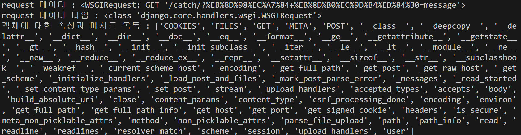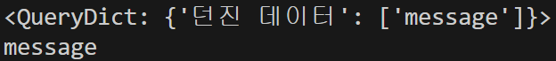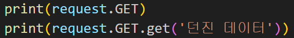 즉, form은 속성을 통해 해당하는 GET이라는 집에 택배를 넣어주었고, 도착한 택배를 열어보니 QueryDict이라는 포장지에 물건이 들어있었다. 이를 key를 통해 뜯어보니 value가 나온 것이다! 이는 form에서 method를 GET이라는 집으로 보냈기 때문에 GET 집에서만 상자를 확인할 수 있는 것이다. 그럼 다른 집도 봐볼까??