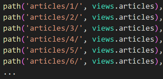 템플릿의 많은 부분이 중복되고, URL의 일부만 반복해서 변경되는 상황이라면 URL과 Template를 새로 작성해야할까? 아니다. 1, 2, 3, 4, 5, 6 부분을 임의의 정수로 정의하면 굳이 여러개를 만들지 않아도 될 것이다.