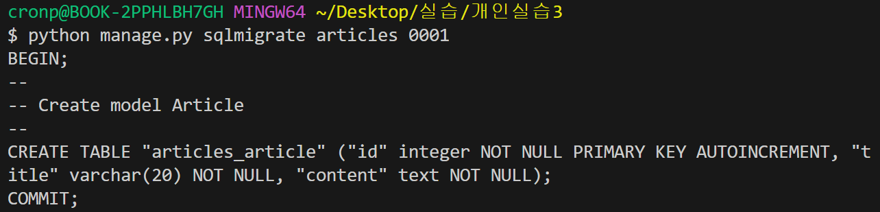 : python manage.py sqlmigrate appname number