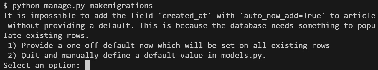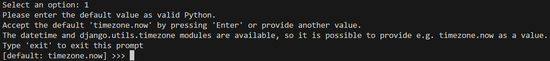 -> 우리의 경우 추가하는 필드의 기본값은 날짜 데이터이기 때문에 직접 입력하는 것보다 Django가 제안하는 기본 값을 사용하는 것이 좋다.. default: timezone.now를 보아하니 현재 시각으로 설정해주는 것 같다. 엔터!!!
