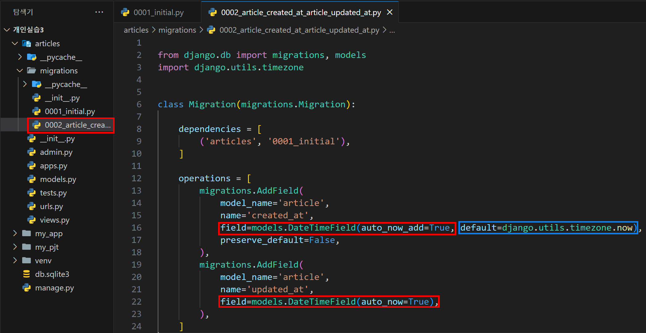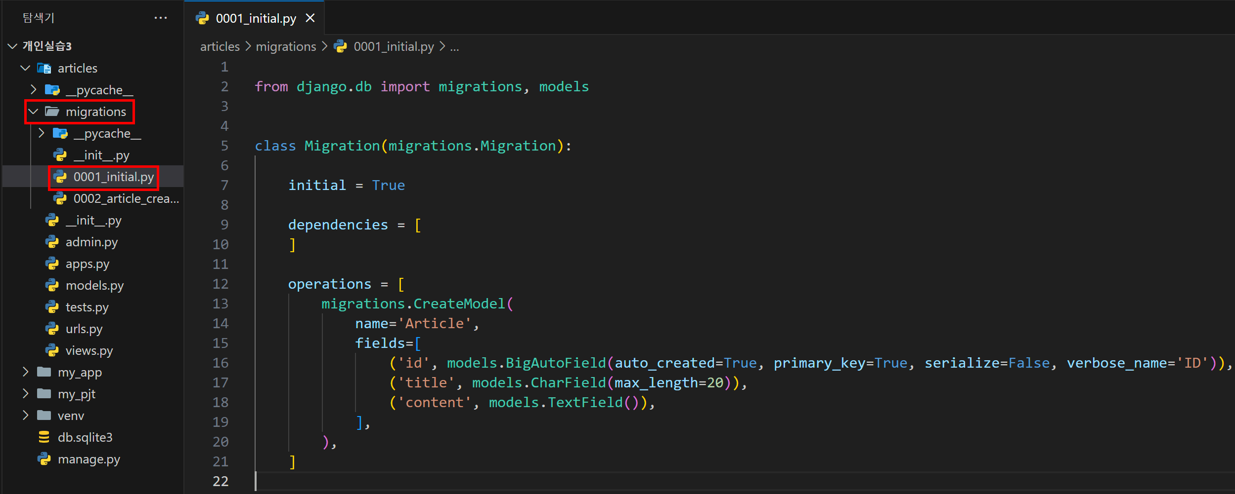 app 파일 내부에 migrations라는 폴더가 있던 것을 보았을 텐데, 이제 해당 폴더로 들어가보면 initial.py로 최초 모델이 등록된 모습을 확인할 수 있다.