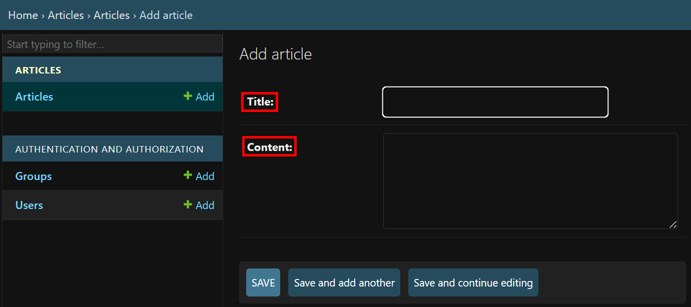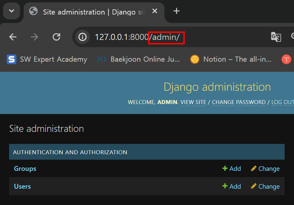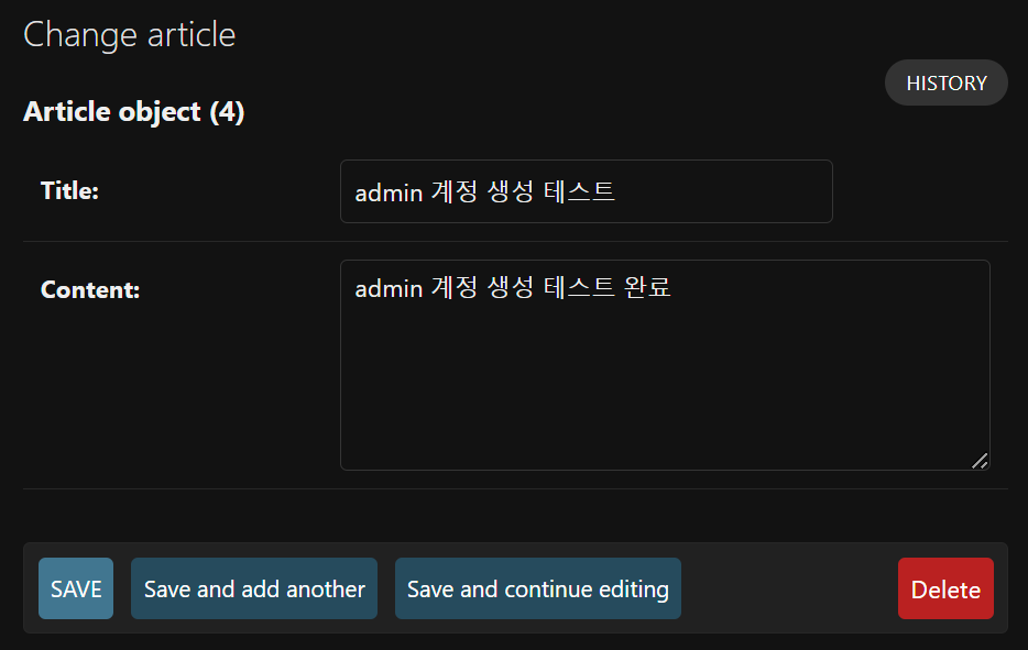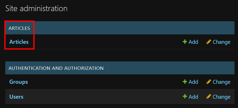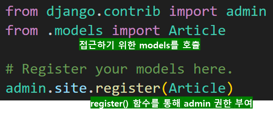 하지만 우리가 등록했던 article 모델의 데이터는 아직 확인할 수 없다. 그 이유는 admin과 app이 연결이 되어있지 않기 때문인데, app 폴더 내부에 admin.py를 수정해주면 접근이 가능하다.