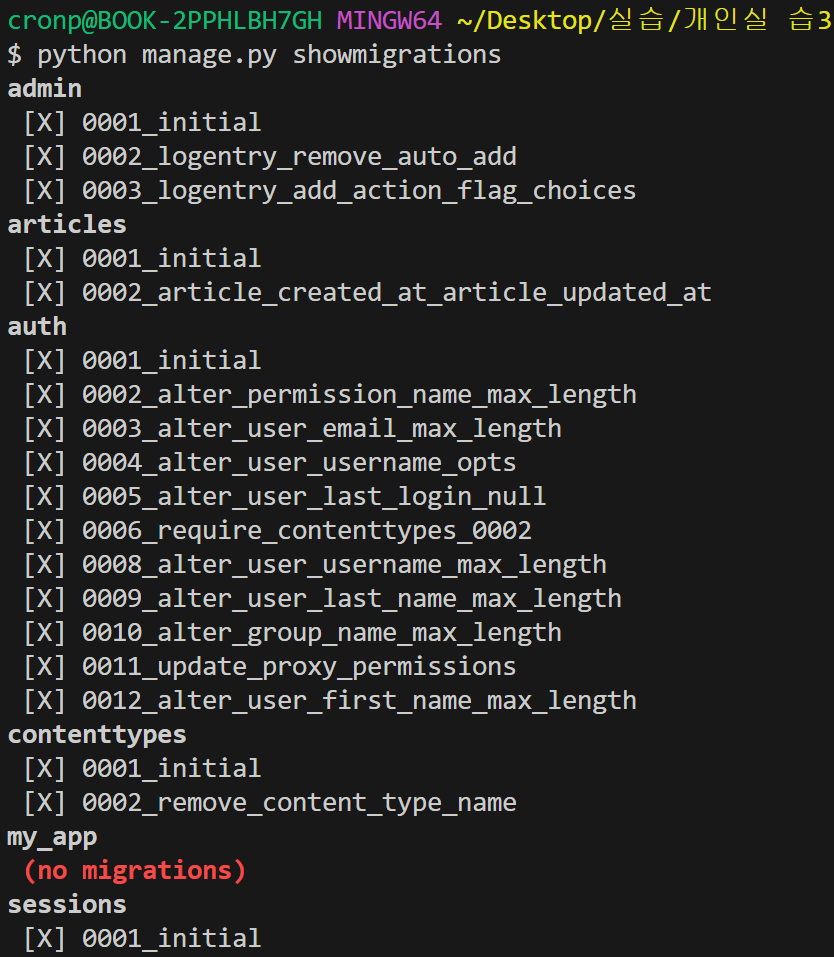 - > migrations 파일들이 migrate 됐는지 안됐는지 여부를 확인하는 명령어