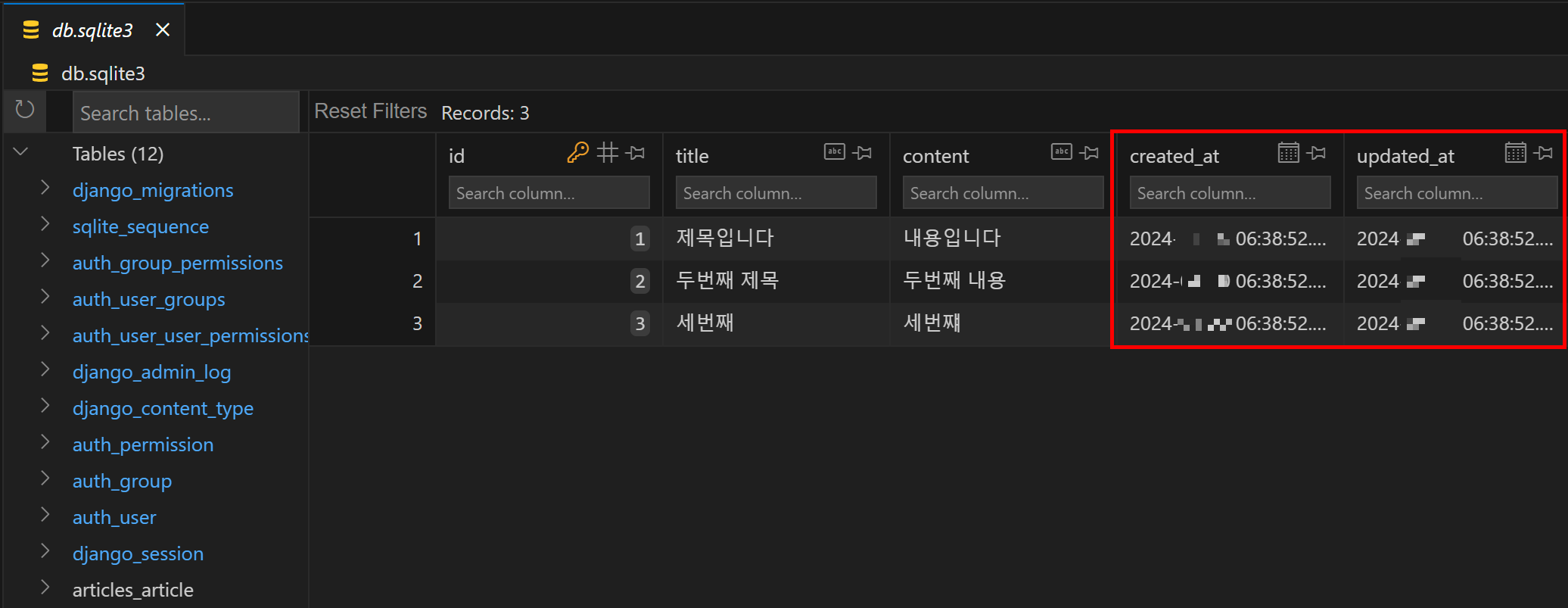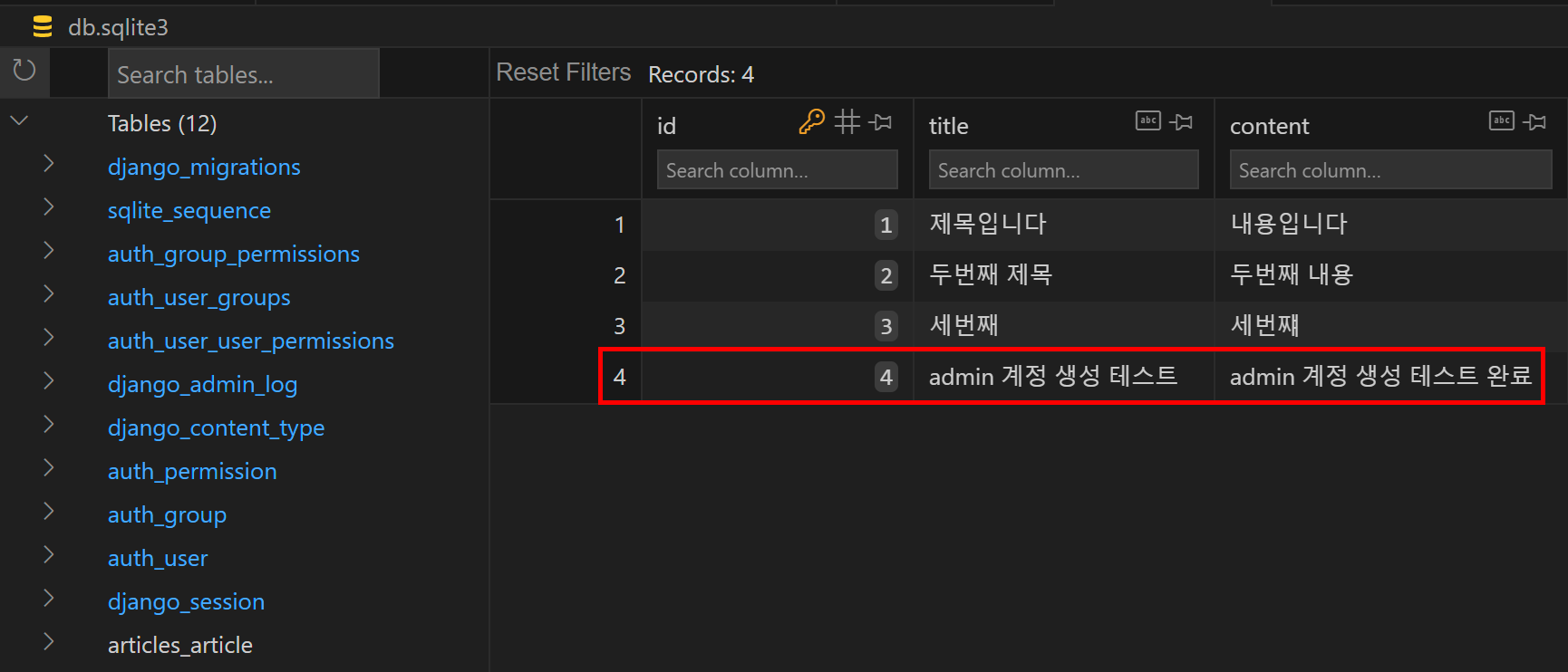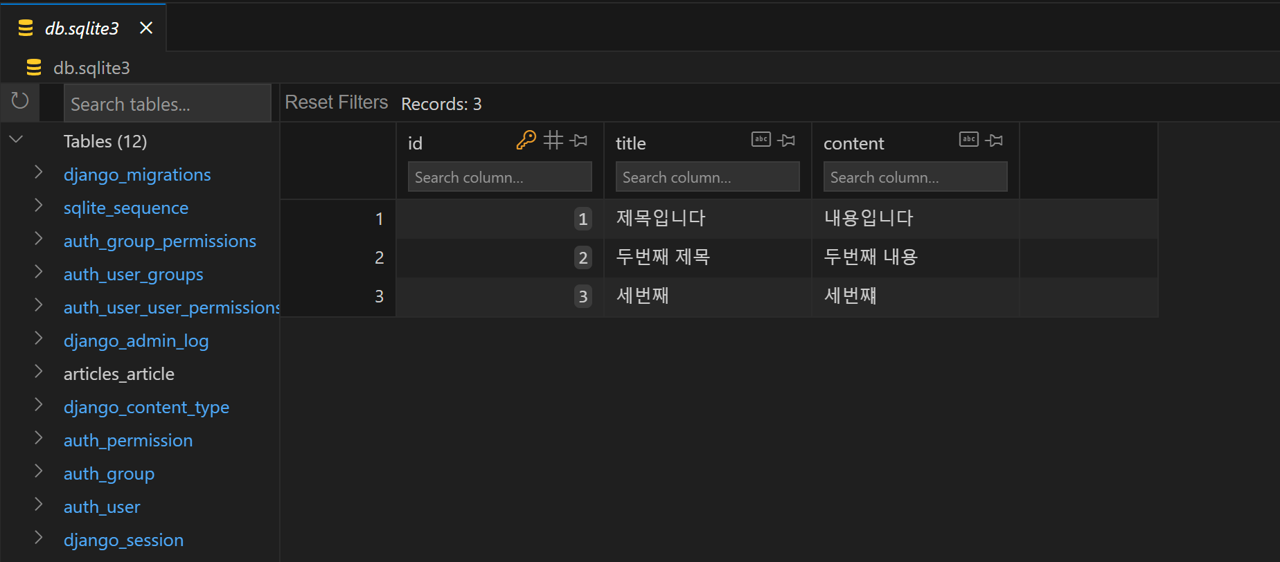 위에서 데이터 3개를 만들어 두었던 것을 보았을텐데, 이는 관리자 계정을 통해 model에 직접 데이터를 넣어준 것이다. 아직 데이터를 저장하는 것을 배우지 않았기 때문에 해당 방법을 사용할 수 있다. 즉, 데이터 확인 및 테스트 등을 진행하는데 매우 유용하다