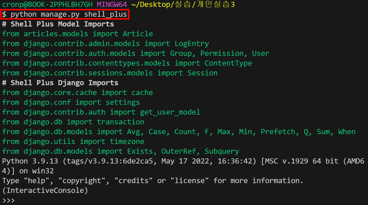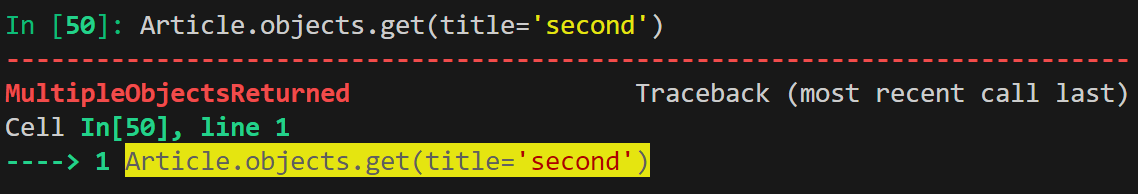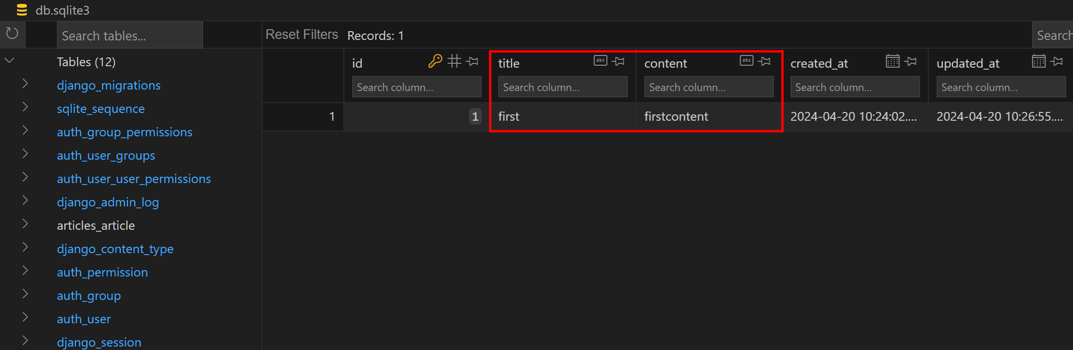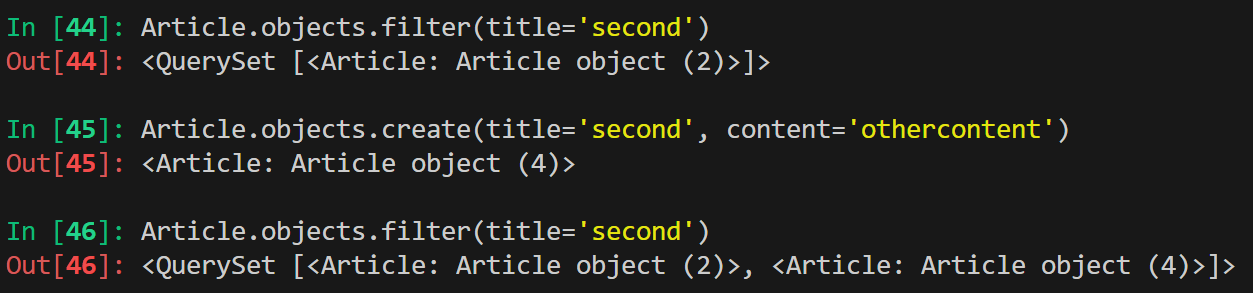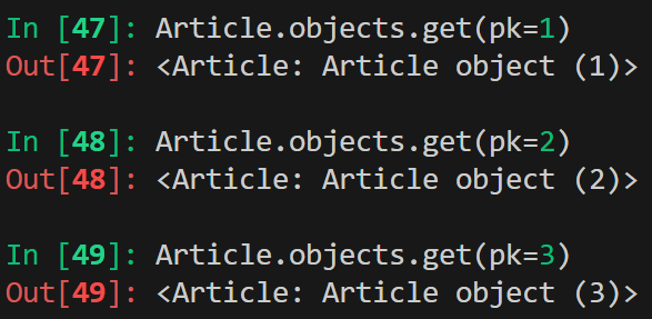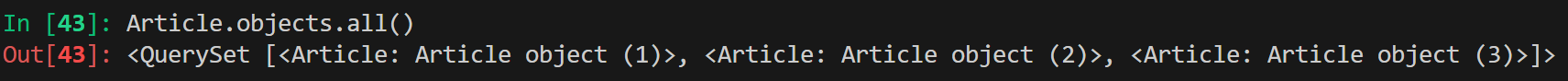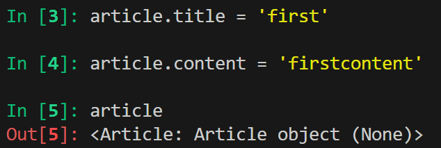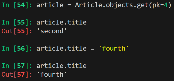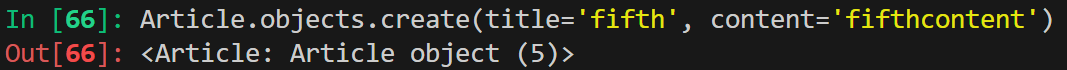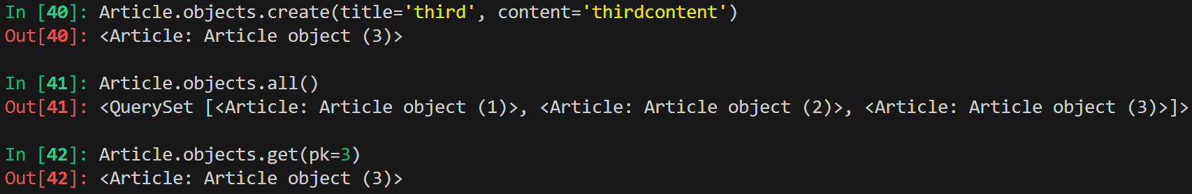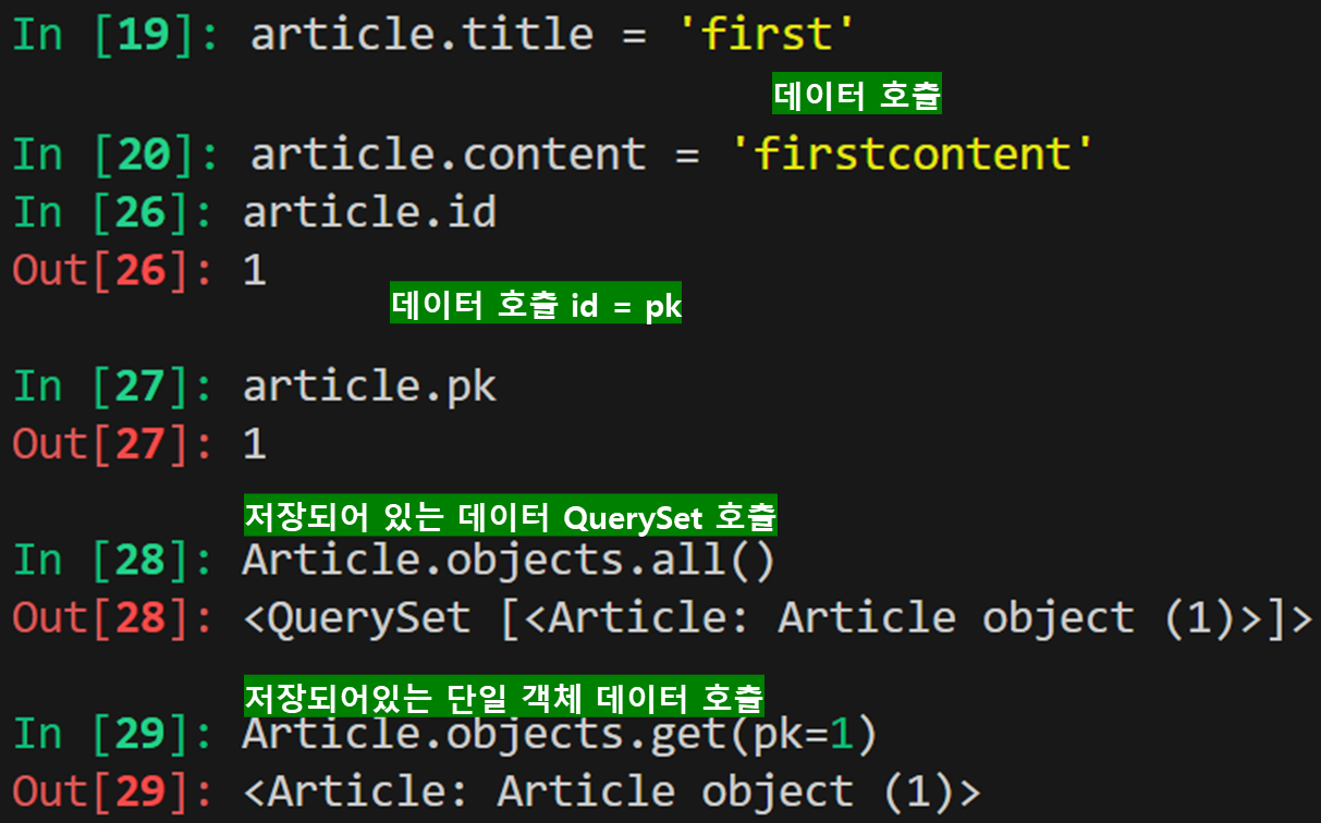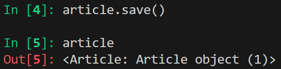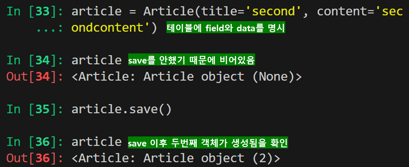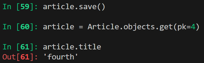 여기서 주의해야할 점은 데이터 베이스에 저장이 되었다고해서 같은 article 변수로 객체 저장을 하게되면 앞의 데이터를 덮어진다. 이 경우 shell_plus 환경을 종료한 후에 다시 접근하거나, 다른 저장방식을 사용, article_2 변수 등 다른 방법을 사용해서 추가 저장을 진행해 줄 수 있다.