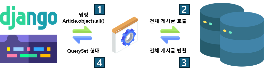: 파이썬으로 작성한 코드가 ORM에 의해 SQL에서 해석되는 언어로 변환되어 데이터베이스에 전달, 데이터베이스의 응답 데이터를 ORM이 QuerySet이라는 자료 형태로 변환하여 반환
