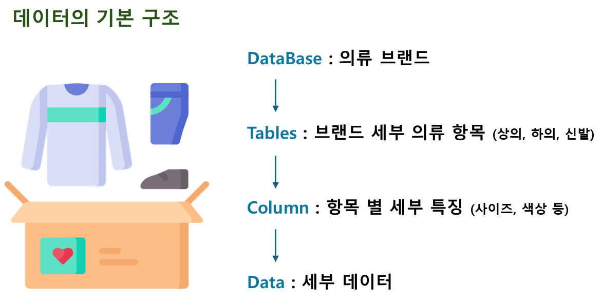 - 테이블, 행, 열의 정보를 구조화하는 방식